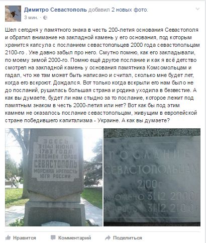 Лирическое настроение, навеянное переплетением времён, наблюдается и в посте журналиста Дмитрия Осипенко. Он, прогуливаясь у памятного знака в честь 200-летия Севастополя, подумал о содержании капсулы посланий, оставленной современниками горожанам будущего. Не будут ли наши записки адресованы «севастопольцам, живущим в европейской стране победившего капитализма»?