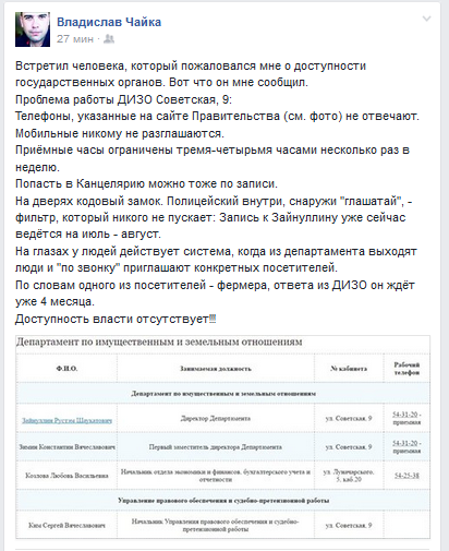 Победить капитализм в России всё же удалось; может, народ также справится и с занятостью чиновников? Общественник Владислав Чайка в Facebook сетует на «приветливость» сотрудников департамента по имущественным и земельным отношениям в Севастополе.