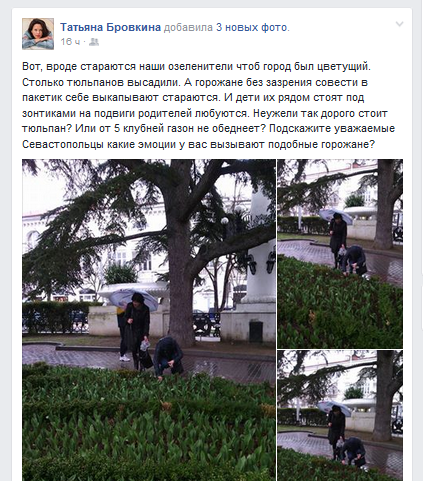 Не совсем понятно, почему автор поста и фото выкапывающих тюльпаны не сделала им замечание? Молодец, конечно, что сфотографировала, но позиция Васёк Красный (СЕВАСТОПОЛЬ) мне кажется более правильной и продуктивной.