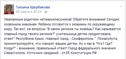 Позавчера предлагала краткий курс истории Севастополя для депутатов провести, со сдачей зачетов. Теперь предлагаю такой же курс для учителей, только не истории, а географии. И тоже со сдачей зачетов. Кто не знает - научится, кто знает и вредничает - того выявить и пресечь.