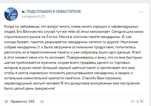 А вообще прелесть жизни – в её непредсказуемости. Вот купил мандарины – жизнь прекрасна, как только их рассыпал по дороге – она ужасна. И только хочешь расстроиться, как на подмогу подбегают неравнодушные и добрые люди. Одному из таких горожан – загадочному, но «милому человеку» – посвящено сообщение в группе «Подслушано в Севастополе».