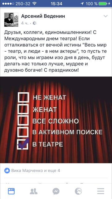И венчает нашу рубрику сообщение, посвящённое театру, ведь сегодня – Международный день театра! Между прочим, некоторые граждане влюблены в театр настолько, что любовную связь с ним зафиксировали галочкой в графе о семейном положении. ForPost поздравляет всех любителей театра словами театрального фаната Арсения Веденина.