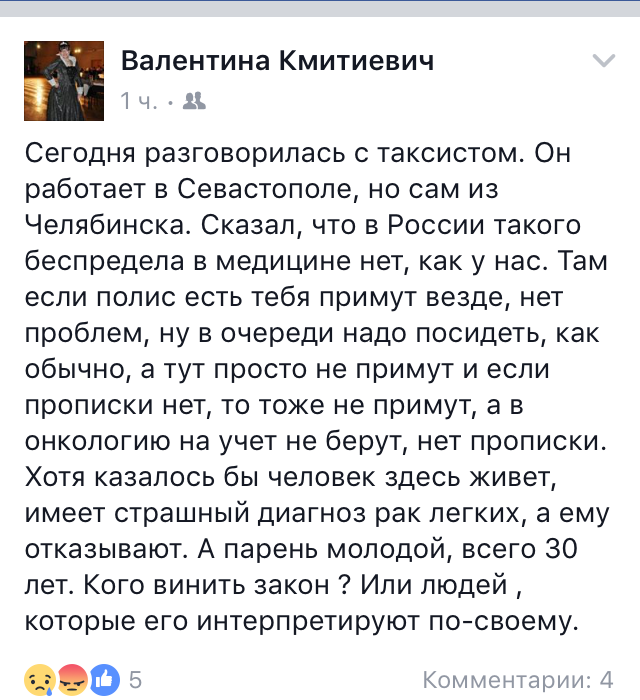 Проблему здравоохранения в отдельно взятом регионе на своей странице в Facebook подняла Валентина Кмитиевич. О беспределе в севастопольской медицине горожанке рассказал таксист из Челябинска. По словам мужчины, очереди в медучреждениях – не самый страшный недуг местной системы здравоохранения.