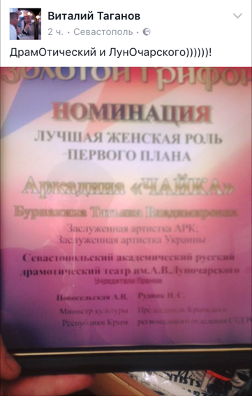 Тем временем артист севастопольского театра имени Луначарского Виталий Таганов показал, что грамотность культуре не помеха. Крымские чиновники от культуры допустили сразу две орфографические ошибки в дипломе победителя театрального фестиваля «Золотой грифон» Татьяны Бурнакиной.