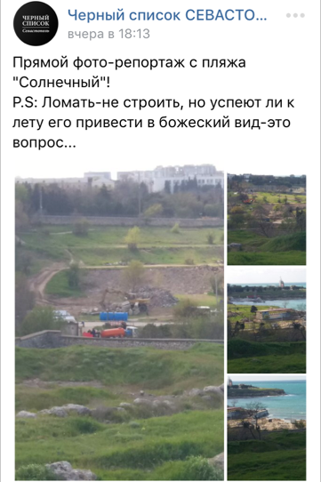 Про Солнечный с других сайтов: Исполнительный директор АО Ривьера , которое производит реконструкцию парка Ахматовой и пляжа Солнечного , Александр Бровкин (г. Москва). Поздно начато производство работ, до лета не успеют. Застройщик обещает огородить стройку и открыть доступ к воде 01 июня 2017г. Будет площадка бетонная постоянная с розетками, вайфаем, и др. приблудами необходимыми на пляже. Волейбольная, футбольная, корты - снесены бульдозером. Что понятно: 1. Канализация, вроде, будет. 2. А вот ливневки как не было, так и не будет! То есть, вся грязь дождем с улицы Н. Островской и окрестностей будет смываться на пляж. 3. Плитка, которая будет положена на пляже, даже 8 см - полная ерунда. 4. Буны будут по периметру с отступом 10-20 см ограждены. И так места мало! 5. ДВА пожарных водоема делается, чтобы море тушить? 6. Открытие только пляжа будет 31 мая 17 г. Вспомнить сколько народу собралось на Солнечном при Украине, и Солнечный отстояли легко. И так по многим стройкам. А сейчас Севастополь не молчит только одиночными пикетами Федорина и Демидова. И всё!. Нет ни депутатов, ни Общественной палаты, фронтовики вообще клоны ЕР . Второй день молчу, как пленный партизан. Подбираю слова цензурные, нецензурными гораздо понятнее бы было описывать то, что в какун сезона наворотили московские воротилы на бюджетные деньги. Что увидела я: разломали корты справа, будут делать слева, разрыли ВСЮ детскую площадку. Вместо нее вкапывают емкость для воды. Вместо пляжного футбола еще один котлован. Пообещали огородить стройку с двух сторон и оставить нам узенький проход к морю и такую же узкую полоску гальки. Все остальное останется за их забором и все лето в этой узкости мы будем отдыхать под лязг тяжелой техники и глотать реконструированную пыль. С ЧЕМ НАС И ПОЗДРАВЛЯЮ, ДОРОГИЕ ЗЕМЛЯКИ. Херсонесу нету. Солнечного тоже уже нету. Санаторий строитель - вход по заоблачному абонементу. Мы в резервации.