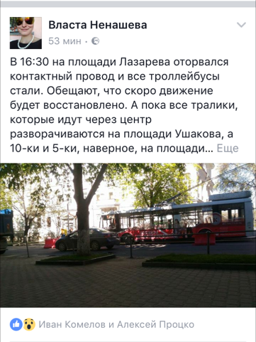 А вот фотографиями из «этой жизни» поделилась журналист Власта Пидпалая. Она стала свидетелем троллейбусного «застоя» в центре города. Причиной его, как оказалось, стал обрыв контактного провода.