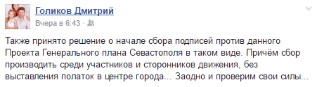 А муниципальный депутат Дмитрий Голиков в Facebook сообщил, что начат сбор подписей против принятия проекта генплана Севастополя в существующем виде. Поскольку на 12 мая назначены публичные обсуждения документа, будет любопытно узнать, сколько подписей успеет собрать активист.