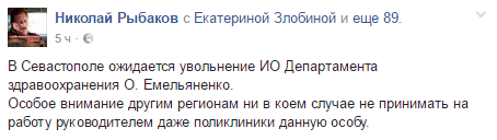 Горожанин Николай Рыбаков поделился в Facebook информацией о готовящейся отставке главы департамента здравоохранения Севастополя Ольги Емельяненко. Наверное, ему известны подробности, пока не успевшие просочиться в СМИ, но он их не раскрыл. Зато дал совет потенциальным работодателям севастопольского чиновника.