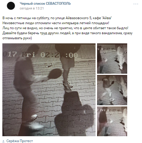 А ещё нашлись горожане, повредившие часть интерьера на летней площадке одного из кафе на улице Айвазовского. Убогость мышления хулиганов засняли камеры видеонаблюдения. Теперь, стоит полагать, к ним в дверь постучаться сотрудники правоохранительных органов с вопросительным выражением лиц.