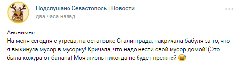Правда, рядом со скамейкой Талипова не было урны для мусора. А вот неизвестная горожанка, написавшая в группе «Подслушано в Севастополе» сайта «Вконтакте», урну нашла. Она даже выбросила в неё мусор. За это тут же была посрамлена. Нельзя, сказали ей, в Севастополе мусор в урну выбрасывать. Вот такие люди.