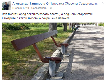 "Общественник Александр Талипов опубликовал фото одной из городских скамеек рядом с Панорамой обороны Севастополя."