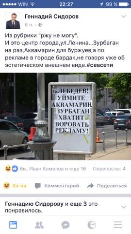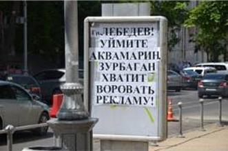 Второй раз имя бывшего министра украинской обороны всплыло в севастопольских «сетях» вместе с вот такой фотографией. Многие помнят прошлогоднюю историю о том, как расположенная на самых выгодных в плане отдачи местах реклама вдруг оказалась заклеена рекламой лебедевских проектов. И пока тянулись разбирательства, пиратская реклама делала свое разбойничье дело. Поэтому нынче пиратов решили предупредить по-хорошему.