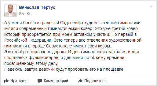 Но давайте лучше о хорошем. Изрядное количество севастопольцев сегодня поделилось с другими своей радостью. Вячеслав Тертус, например, помог отделению художественной гимнастики обзавестись ковром. Это обошлось ему дорого, причем не только в финансовом смысле, но он все равно очень рад сделанному доброму делу.
