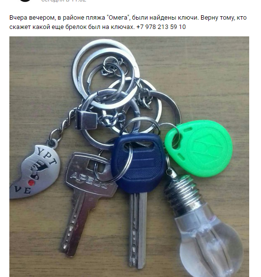 ВКонтакте кто-то разместил фотографию утерянных ключей. И хотя эта информация размещена в группе «Черный список. Севастополь», автор объявления явно играет на «светлой стороне». Автору – респект. Хозяин ключей, найдись!