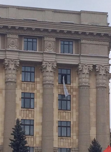 Активные участники митинга водрузили над входом в здание обладминистрации русский флаг и флаг Харькова. Кроме того, один митингующий залез на крышу здания и начал размахивать триколором.