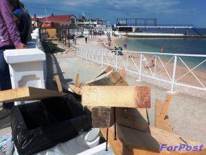 Ко времени начала схода оказалось, что на пляже уже шли работы по демонтажу нашумевшей конструкции. Во всяком случае, сновали какие-то люди, естественно, без униформы, спецодежды. Не берусь сказать о той профессии, должностные обязанности по которой они выполняли, но их внешний вид и отсутствие рабочих навыков говорили максимум, как о чернорабочих. Вокруг на гальке валялись саморезы и острая щепа, которая уж никак не свидетельствовали, что перед этими людьми поставлена задача заботиться о безопасности отдыхающих. Разумеется, что импровизированная стройплощадка, возникшая на вполне функционирующем пляже, никем не огораживалась. Во время работы по ней перемещались и дети, и велосипедисты …