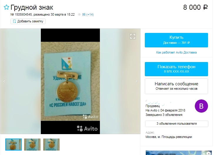Одно из предложений о продаже нагрудного знака ориентировано на столичных нумизматов – забрать товар предлагается в Москве на площади Революции.