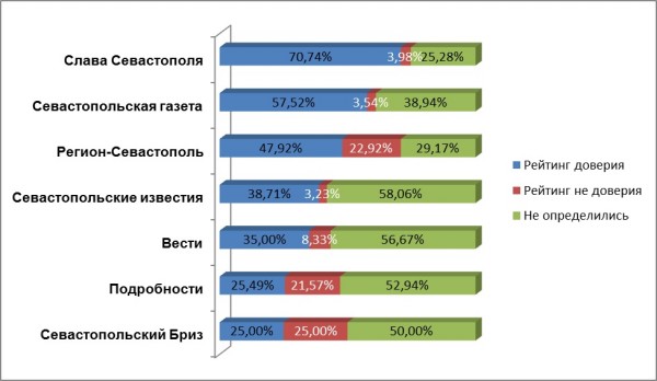 Уважающие себя социологи обычно указывают Где? Когда? и среди Какой аудитории? проводился опрос. Насколько мне известно, у "Славы Севастополя" самый большой тираж, распространяется она не только по подписке, но и через киоски "Союзпечать", но это не показатель степени доверия. Что касается "Регион Севастополь", то партийная дисциплина принуждает подписывать депутатов своих избирателей, но читать там, откровенно говоря, нечего - НЕ ЗЛОБОДНЕВНО, вся газета - сплошная передовица.