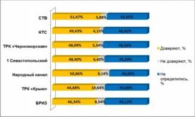 Аутсайдер по степени доверия своей аудитории государственная ТРК «Крым» (44,68%) и занимает самый высокий уровень недоверия (10,64%). Так же больше всего зрители не доверяют новостям на Народном канале (9,14%) и БРИЗе (8,54%), а меньше всего не доверяют новостям на НТС (4,15%).