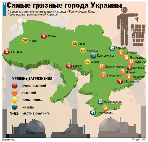 Остальные лидеры черного списка находятся там уже несколько лет. На первом месте, как и в 2010 году, -Мариуполь. Второе место в прошлом году занимала Макеевка, третье - Днепродзержинск. В этом году эти восточноукраинские промышленные центры разбавили Ужгород, Одесса и Ровно. И если Одесса уже давно находится в десятке самых грязных, то наличие там Ужгорода и Ровно удивляет.