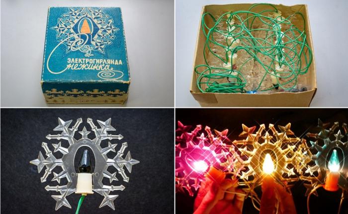 Есть в коллекции Олега Сорокина и выпущенная заводом в 1976 году четырёхцветная электрогирлянда «Снежинка». Она состоит из 18 светильников в виде снежинок, каждая из которых размером примерно с ладонь. Цена – ровно 4 рубля.