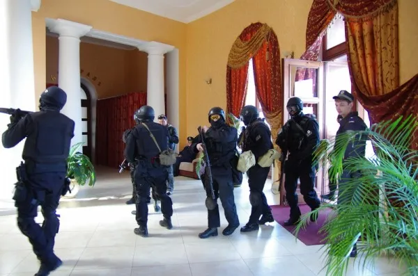 Офицеры спецподразделения СБУ «Альфа» неожиданно для «террористов» ворвались в помещение ресторана и обезвредили вооруженных «бандитов». «Заложники» не пострадали.