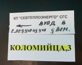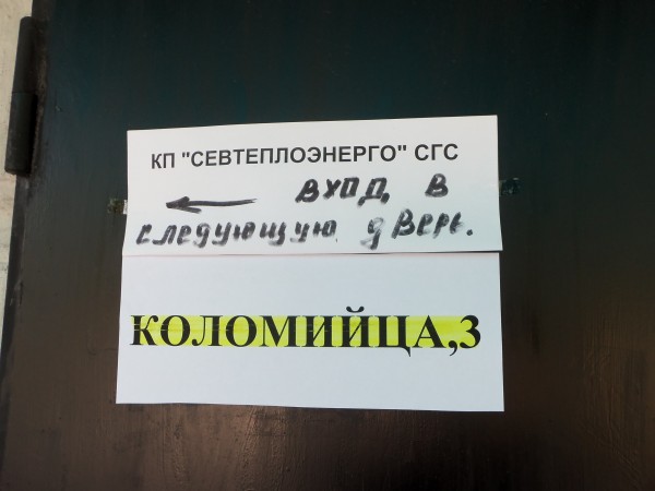 Попетляв, как в лабиринте, многострадальный клиент натыкается на свежевыкрашенную дверь без вывесок и других «опознавательных знаков». По иронии судьбы именно за ней и расположилось КП «Севтеплоэнерго». И только в глубине тёмного коридора на двери кабинета №10 находится единственная табличка «Расчётный Центр».