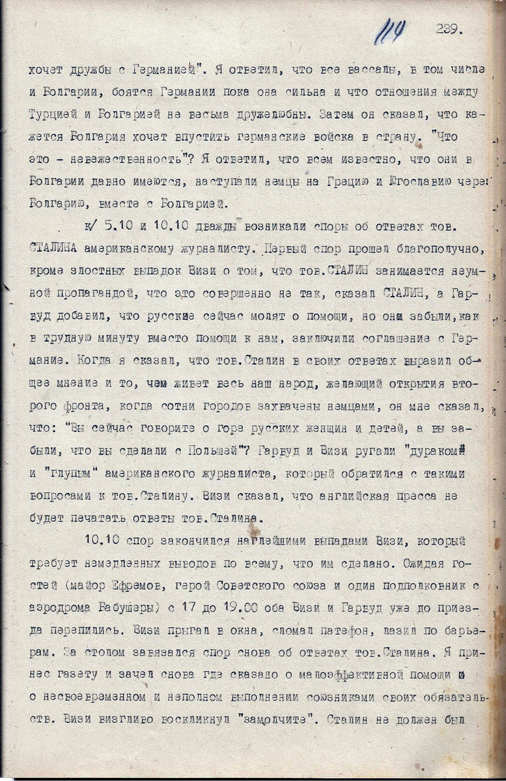«Дважды возникали споры об ответах тов. Сталина американскому журналисту. Первый спор прошёл благополучно, кроме злостных выпадов Визи о том, что тов. Сталин занимается неумной пропагандой. Что это совершенно не так сказал Сталин. А Гарвуд добавлял, что русские сейчас молят о помощи, но они забыли, как в трудную минуту вместо помощи нам заключили соглашение с Германией. Когда я сказал, что тов. Сталин в своих ответах выразил общее мнение и то, чем живёт весь наш народ, желающий открытия второго фронта, когда сотни городов захвачены немцами, он мне сказал, что: „Вы сейчас говорите о горе русских женщин и детей, а вы забыли, что вы сделали с Польшей?” Гарвуд и Визи ругали „дураком” и „глупым” американского журналиста, который обратился с такими вопросами к тов. Сталину. Визи сказал, что английская пресса не будет печатать ответы тов. Сталина…