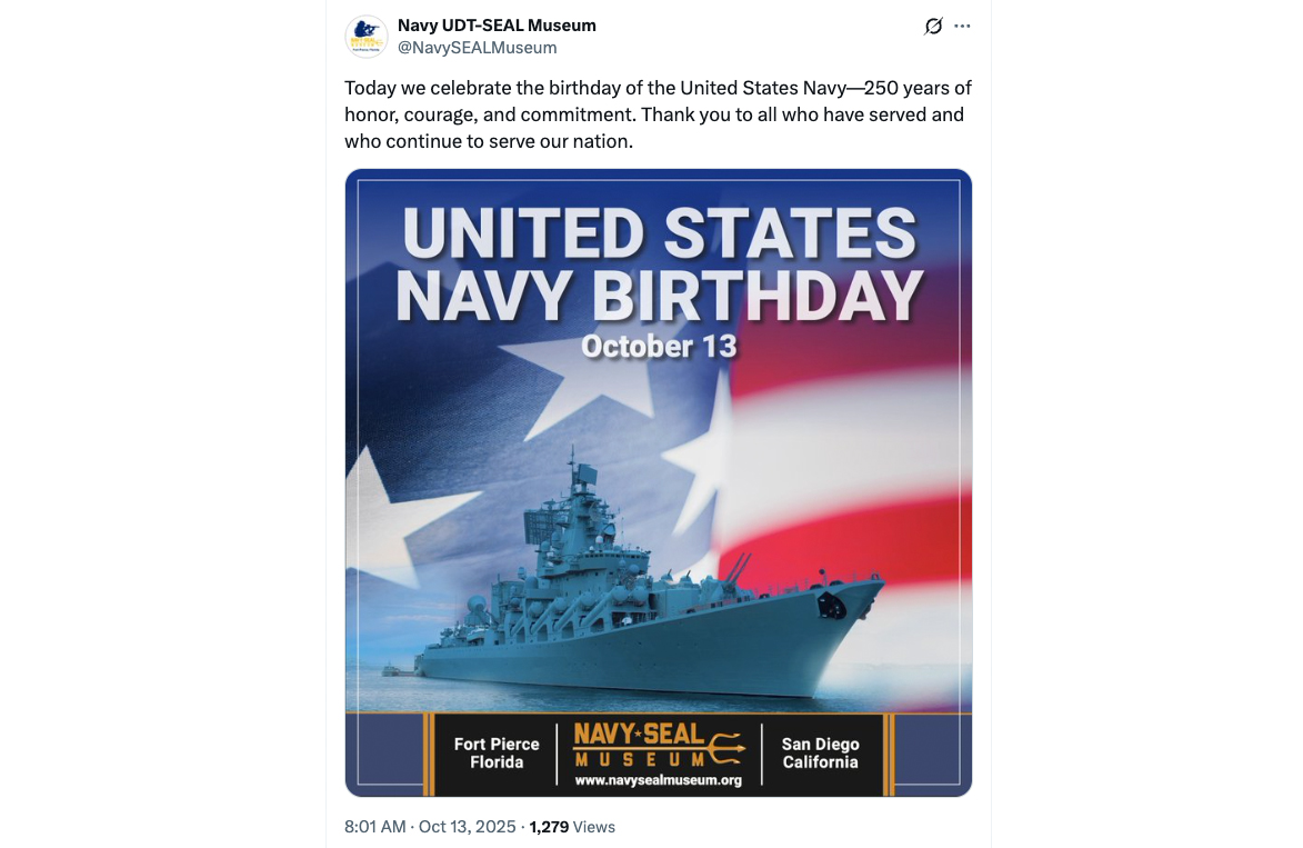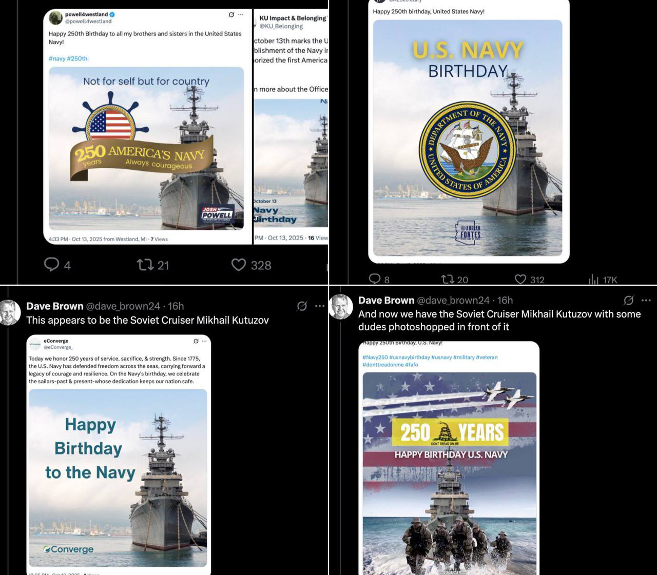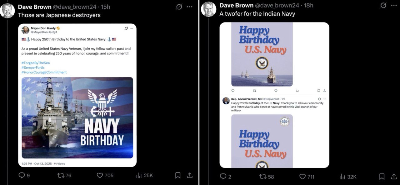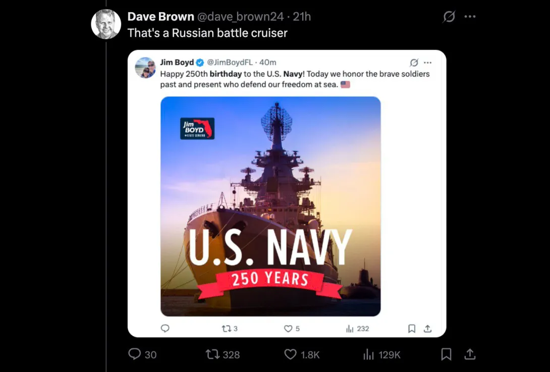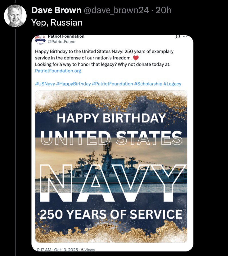 Браун написал в соцсети X: «Это же российский крейсер!», после чего музей поспешил удалить публикацию и вообще закрыл аккаунт. Но было поздно — «пример» подхватили десятки ветеранских и общественных организаций, которые по очереди начали поздравлять флот теми же «русскими красавцами».