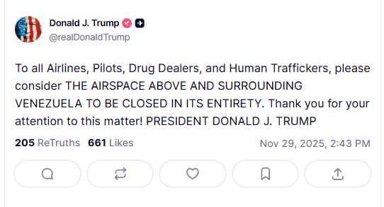 «Всем авиакомпаниям, пилотам, торговцам наркотиками и людьми: пожалуйста, учтите, что воздушное пространство над Венесуэлой и вокруг неё закрыто полностью», — написал Трамп 29 ноября в своей социальной сети Truth Social.