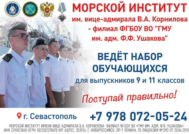 Морской институт им. В.А. Корнилова - Филиал ФГБОУ ВО «ГМУ им. адм. Ф.Ф. Ушакова» приглашает выпускников 9 и 11 классов на 2025 год! У нас ты получишь качественное морское образование и откроешь двери в востребованную рабочую профессию!