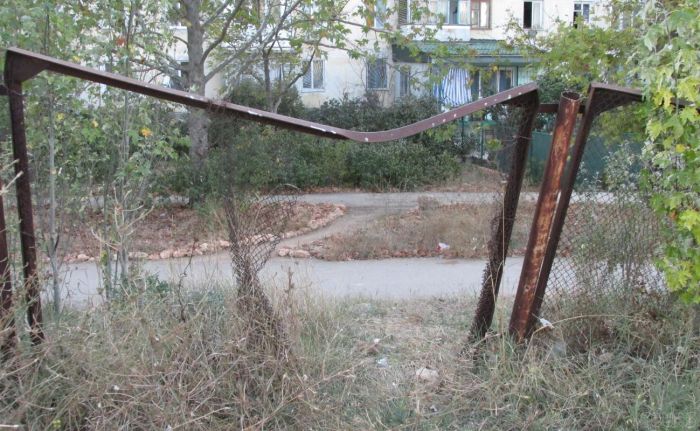 Ржавая, выломанная целыми секциями ограда, через которую, сокращая путь, шествуют местные бомжи, а некоторые из них устраиваются прямо в кустах за бутылочкой «красной шапочки».