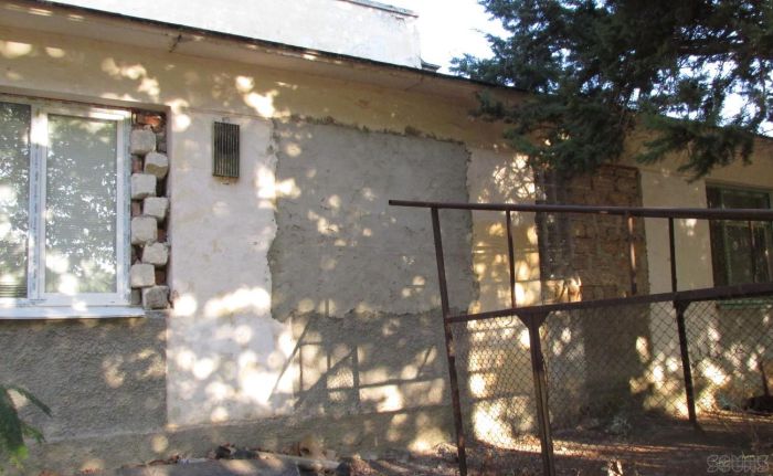 На обшарпанных стенах с тыльной стороны школы видны проёмы окон, наспех заделанные кирпичами. Здесь же старые кресла — по словам детей, там курят «тёти из столовой».