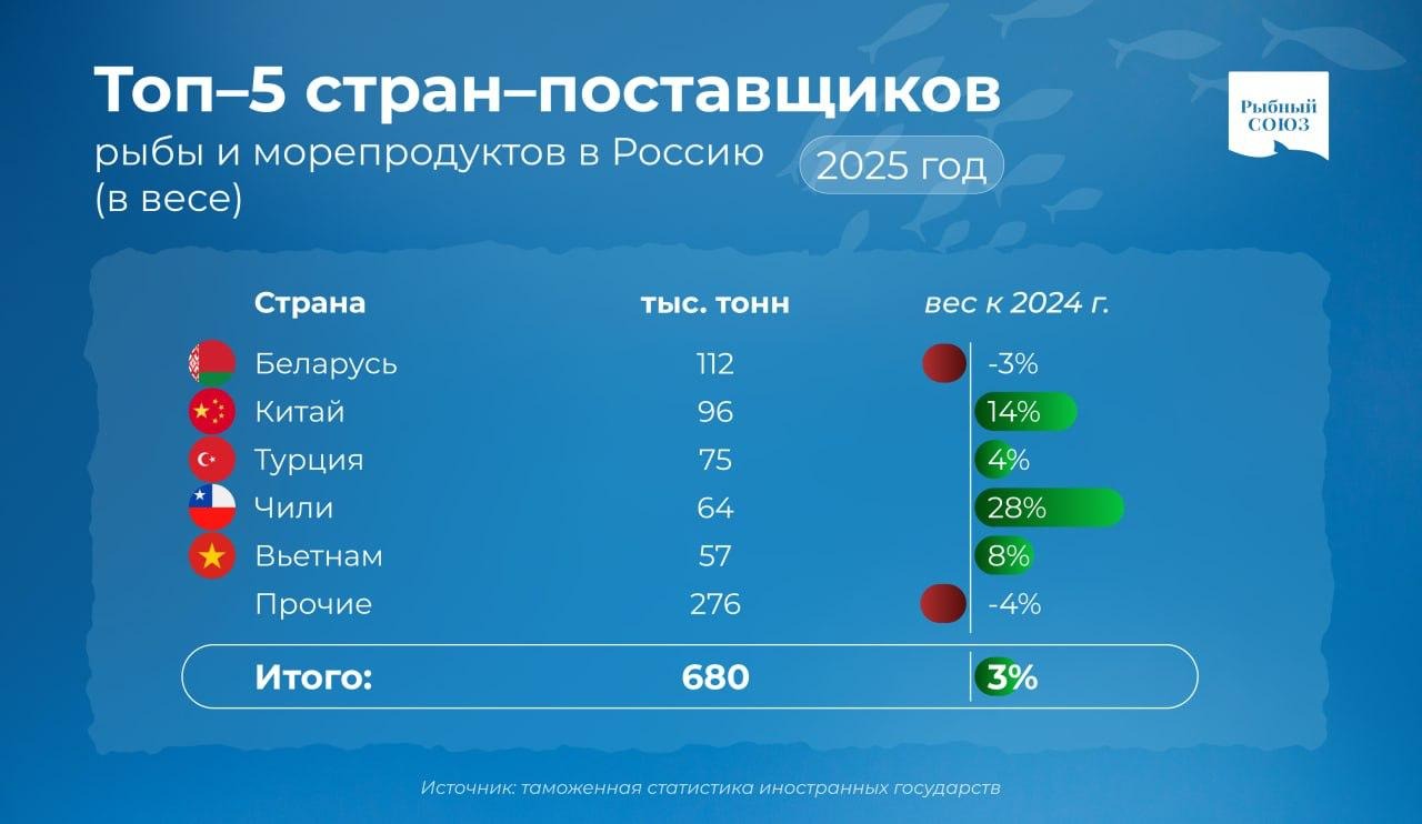 По данным Рыбного союза, в целом российский импорт рыбы и морепродуктов к концу 2025 года увеличился на 3% в весе и на 7% в деньгах, достигнув 680 тыс. тонн на сумму 3,1 млрд долларов.