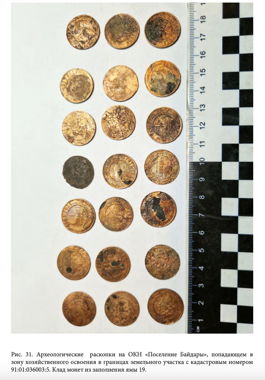 Клад — лишь часть материалов, которые археологи подняли с участка (кадастровый номер: 91:01:036003:5). Всего исследован 891 квадратный метр, выявлено 53 объекта: хозяйственные ямы, колодец и фундамент строения. Среди находок — керамическая посуда XVIII–начала XX века, стеклянные флаконы, цветочные горшки, а также элементы конского снаряжения: стремена, подковы и удила.