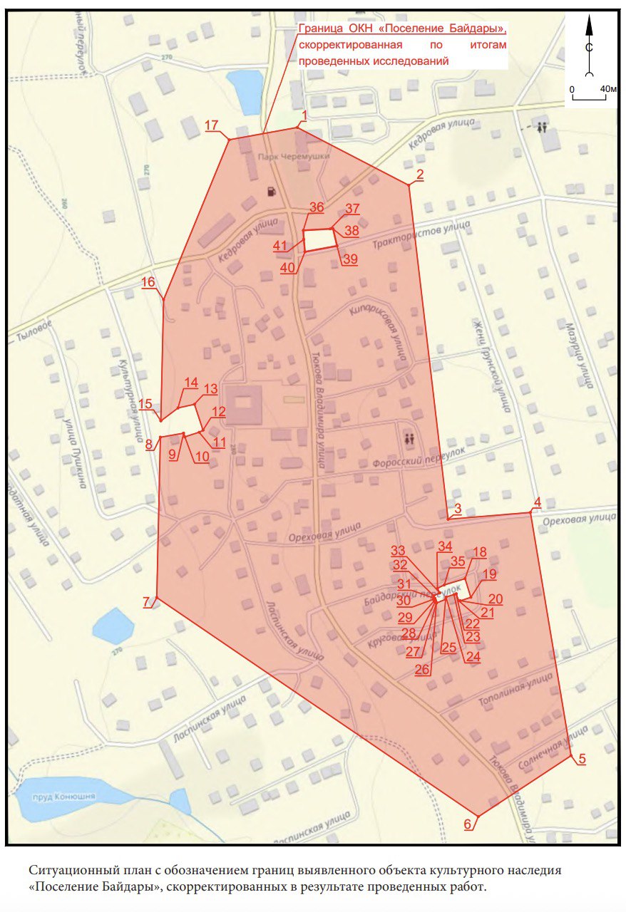 Из территории «Поселения Байдары» исключили обследованную площадь — она считается полностью изученной и больше не ограничена статусом ОКН. Археологи указали, что работы по сохранению проведены в полном объёме, а сам участок может быть передан под строительное освоение в соответствии с проектом.