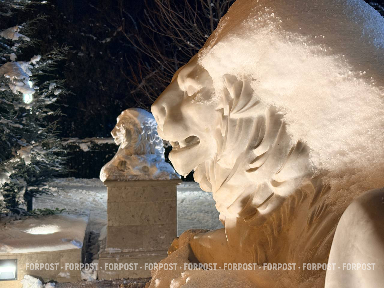Мраморные львы Матросского бульвара нарядились в пышные белые шапки.