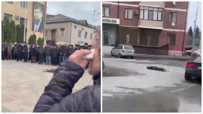 Действо происходит на площади возле администрации Ачхой-Мартанского муниципального района, за кадром слышен женский плач. На другом видео — тело лежит на улице, его объезжают автомобили.
