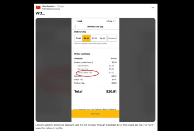 Посетители ресторанов обрушились с критикой на гигантскую сеть фастфуда и ее партнеров по доставке из-за растущего списка дополнительных расходов. К ним относятся плата за доставку, плата за обслуживание, наценки на меню и — что, пожалуй, самое интересное — спорная «плата за малый заказ», которая взимается, если клиент заказывает недостаточно.