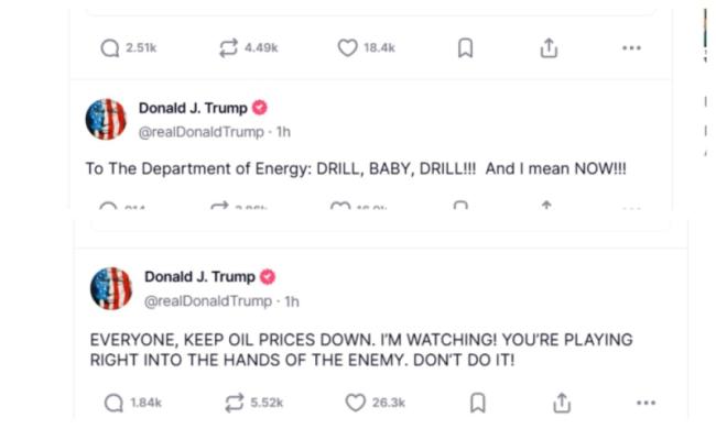 К кому обращался Трамп в первой части заявлений понять сложно, но даже Минэнерго США вряд ли сможет повлиять на уровень нефтяных цен. Президент США может отдать приказ американскому Минэнерго, или DOE. Президент может издавать указы для управления исполнительной ветвью, включая DOE. Например, Трамп уже использовал указы для отмены экологических ограничений на бурение (как в 2017 году).