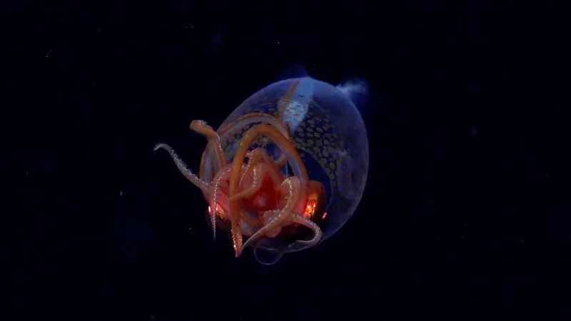 На кадрах можно увидеть прозрачное тело редкого существа и восемь розовых щупалец. Отличительной чертой гигантских кальмаров являются крючки на концах двух длинных щупалец и в середине каждой из восьми более коротких конечностей.