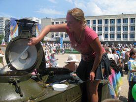 Больше всего людей было в двух местах: возле полевых кухонь, где разливали вкусную уху из красной рыбы и на подходе к зданию УКИЦ, где разместилась машина-фургон с бесплатными продовольственными наборами от депутата городского Совета Дмитрия Белика.