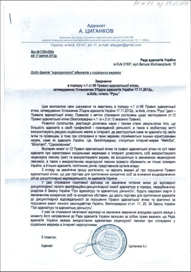 Первый документ – это обращение некоего киевского адвоката Андрея Цыганкова к председателю НААУ Лидии Изовитовой. Из него следует, что кляузника очень возмущает тот факт, что в социальных сетях «Фейсбук», «Вконтакте» и «Одноклассники» регистрируются адвокаты под своим именем и «позволяют себе использовать нецензурную лексику (мат) и выражения, которые ассоциируются с указанной нецензурной лексикой, открыто оскорбляют не только граждан Украины, но и других адвокатов, политических деятелей, представителей органов власти».