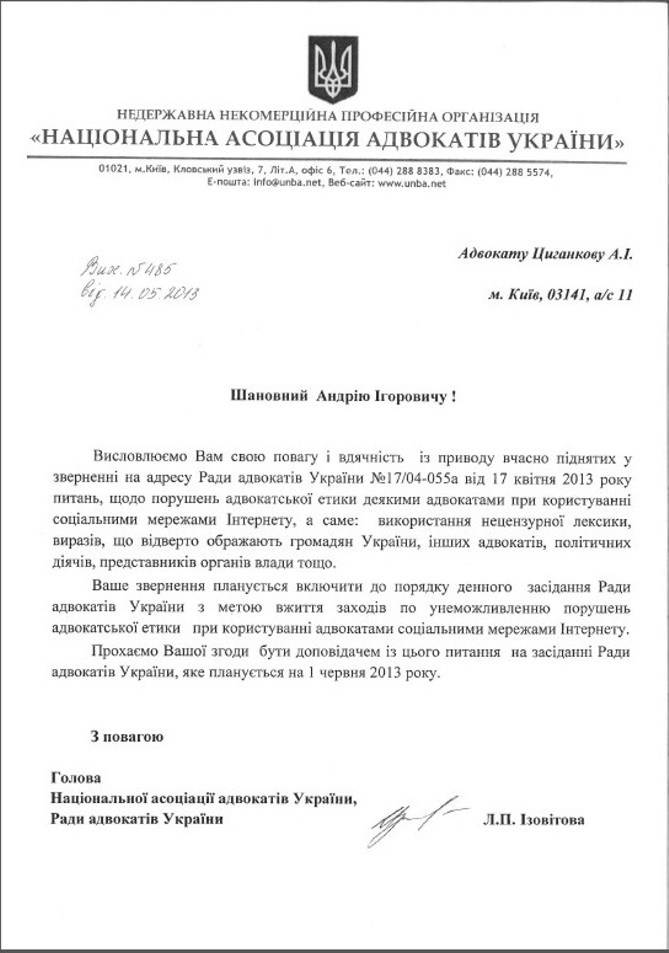 Именно поэтому «Ваше обращение планируется включить в повестку дня заседания Совета адвокатов Украины с целью принятия мер по недопущению нарушений адвокатской этики при пользовании адвокатами социальными сетями Интернета».