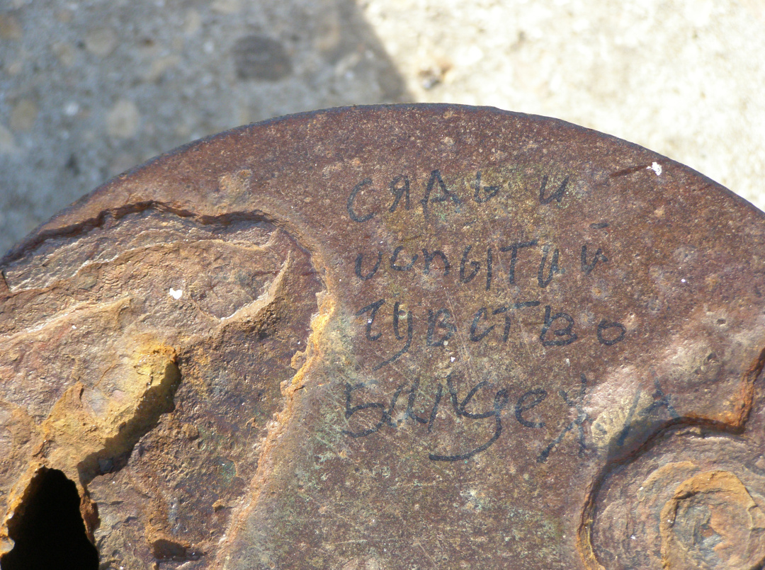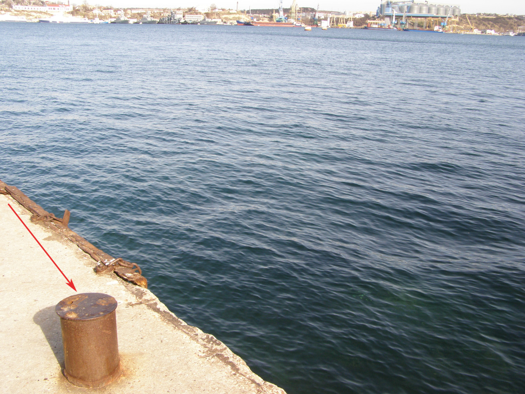 Кнехт на причале Аполлоновой бухты Севастополя и надпись - по красной стрелке - на нём...