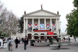 Очень символично, что вокруг театра выставлены противотанковые ежи.