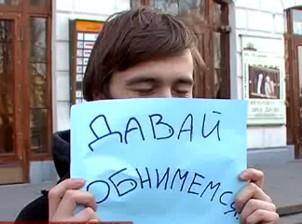На этих кадрах австралиец Хуан Манн. Его выход в люди с плакатом «Бесплатные объятия» стал примером для подражания миллионов людей по всему миру – в том числе и севастопольских ребят. Вот уже третий год они собираются вместе, рисуют плакаты и обнимают прохожих.