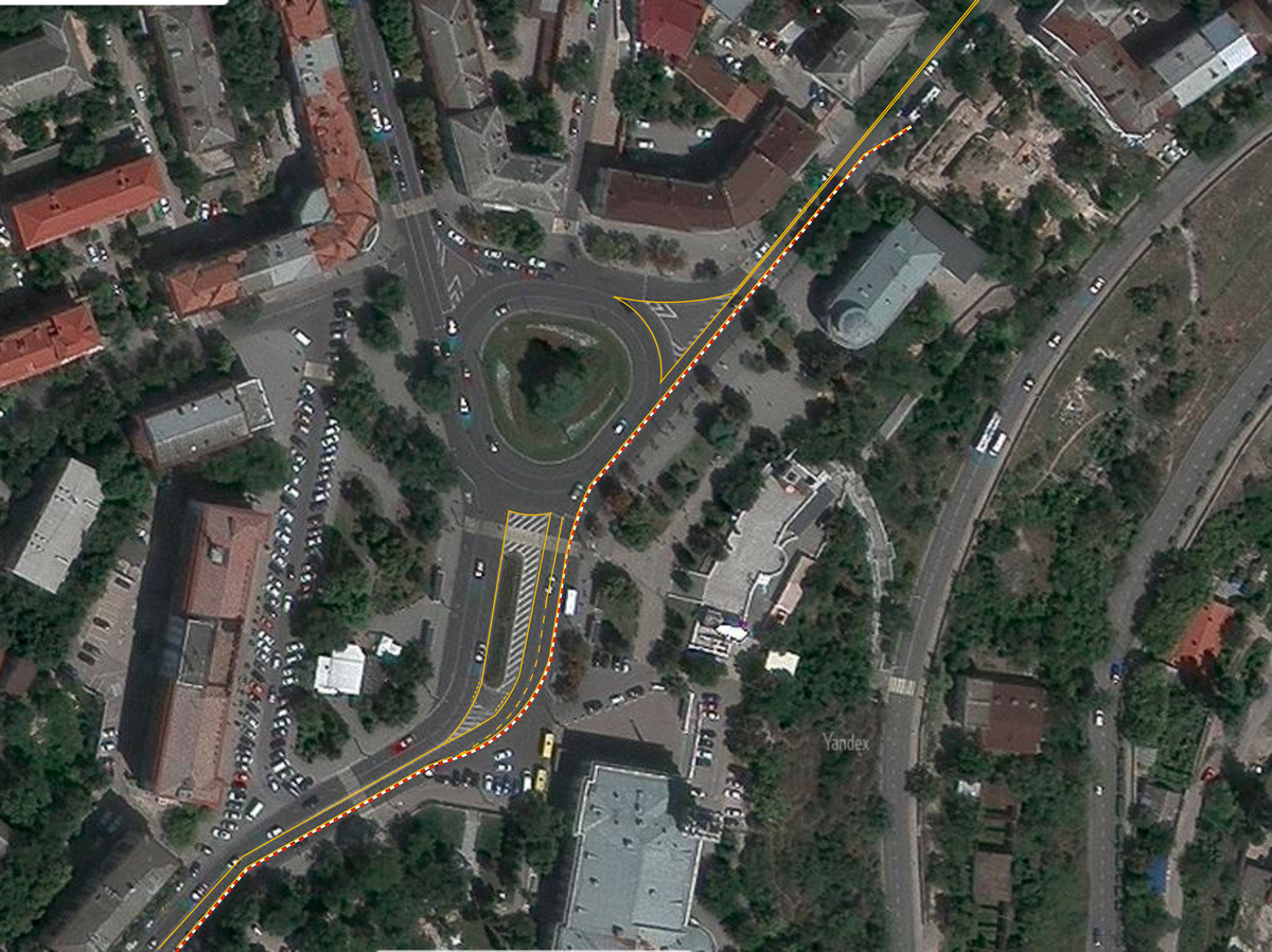 Изменения схемы движения на площади Ушакова. Красным отмечена полоса, которую уберут на время реконстркуции. Схема (кликабельна) пресс-службы правительства Севастополя