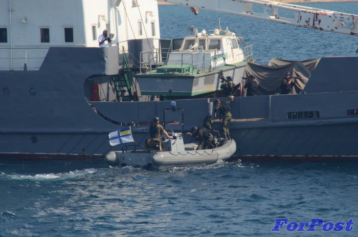По условиям учения гражданское судно захвачено террористами. В роли пострадавших от действий пиратов выступил экипаж судна экологического контроля «Петр Градов». Для освобождения команды при помощи быстроходных катеров была успешно осуществлена высадка на судно групп специального назначения.