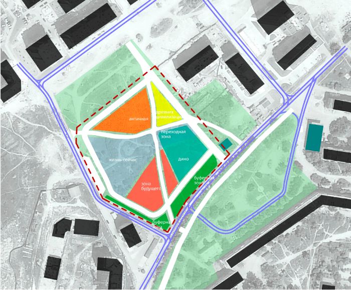В парке, согласно требованиям заказчика в лице правительства Севастополя, должно быть шесть зон: «Древние цивилизации», «Античная», «Переходная зона», «Дино», «Жизнь сейчас» и «Зона будущего».